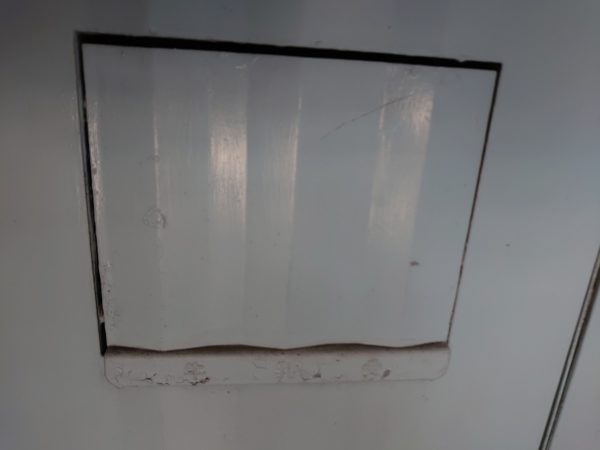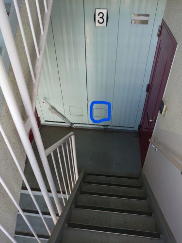 階段を見てみると。各戸の玄関の前の壁にに小さく四角の切れ込みが入った個所があります。